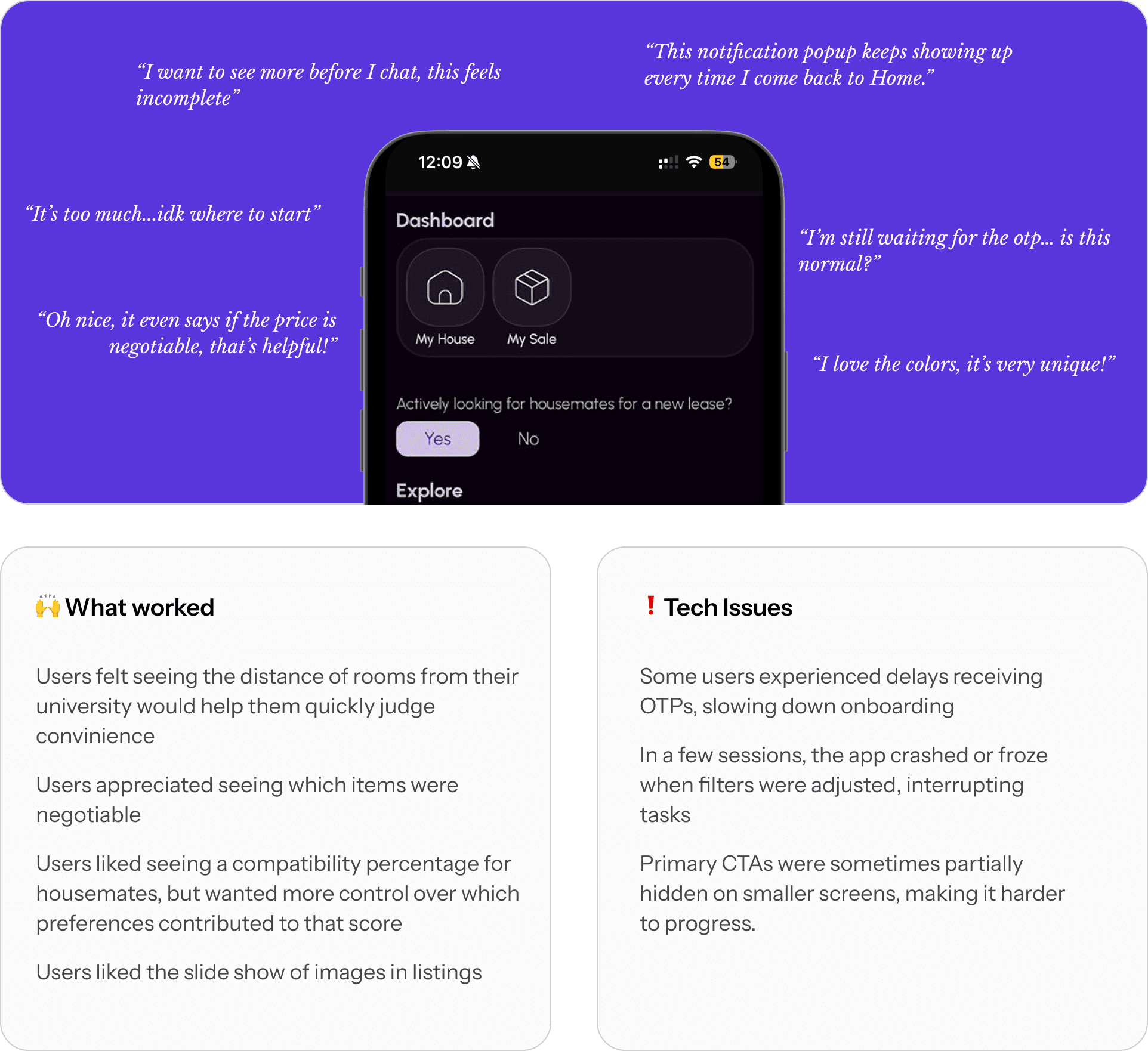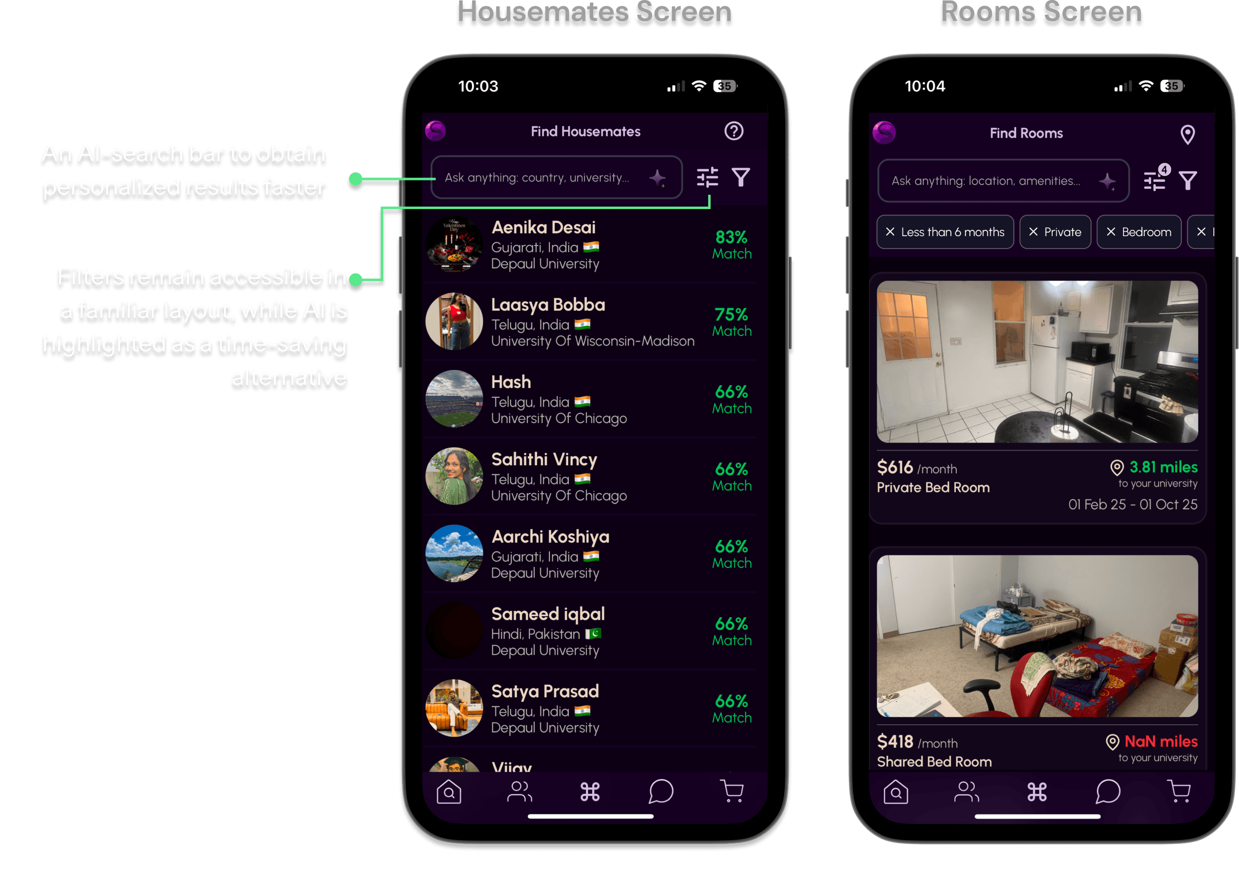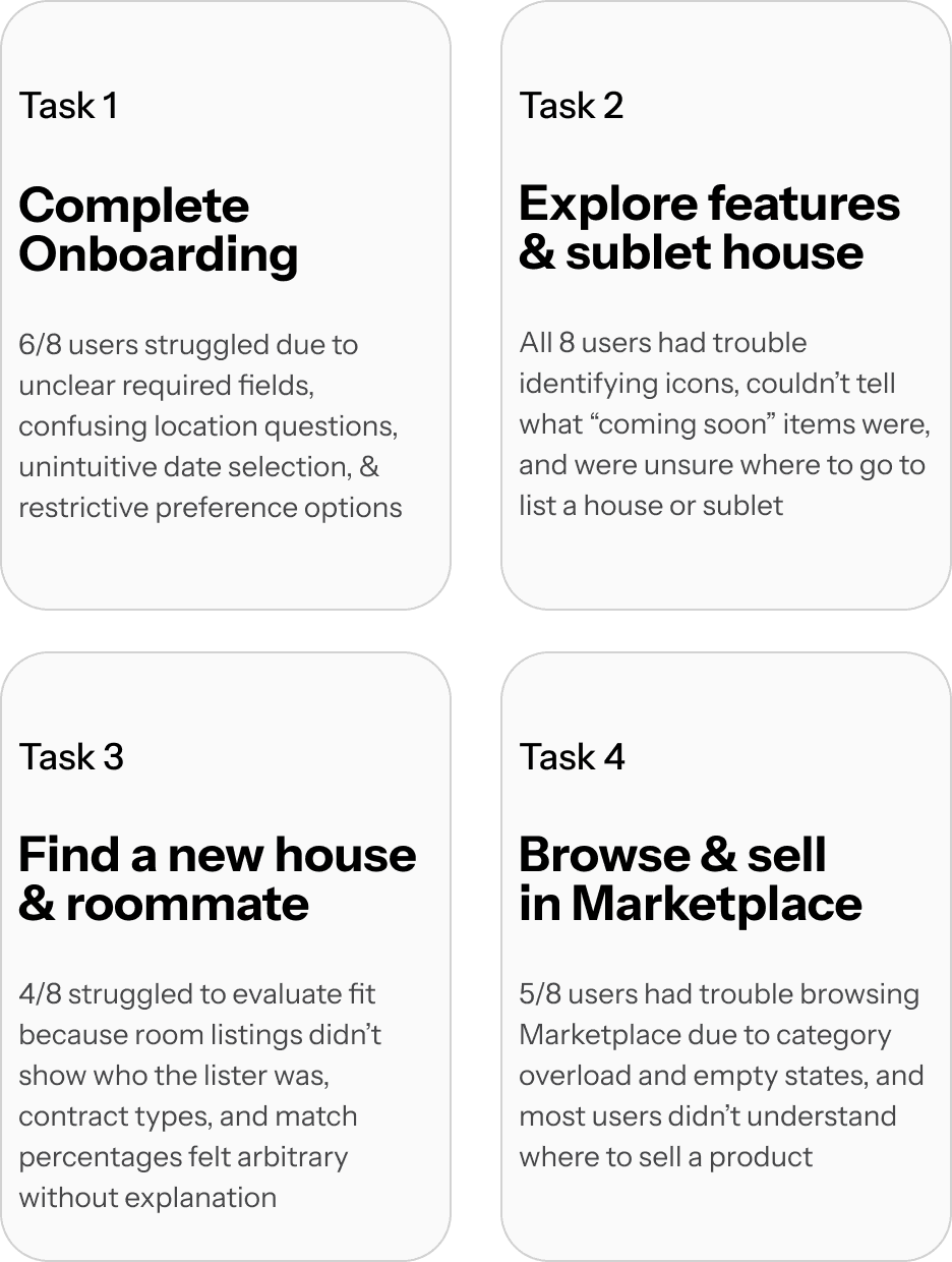Students couldn’t tell which profiles or listings were genuine, and filters didn’t behave in ways they expected, making it harder to trust the matches and results