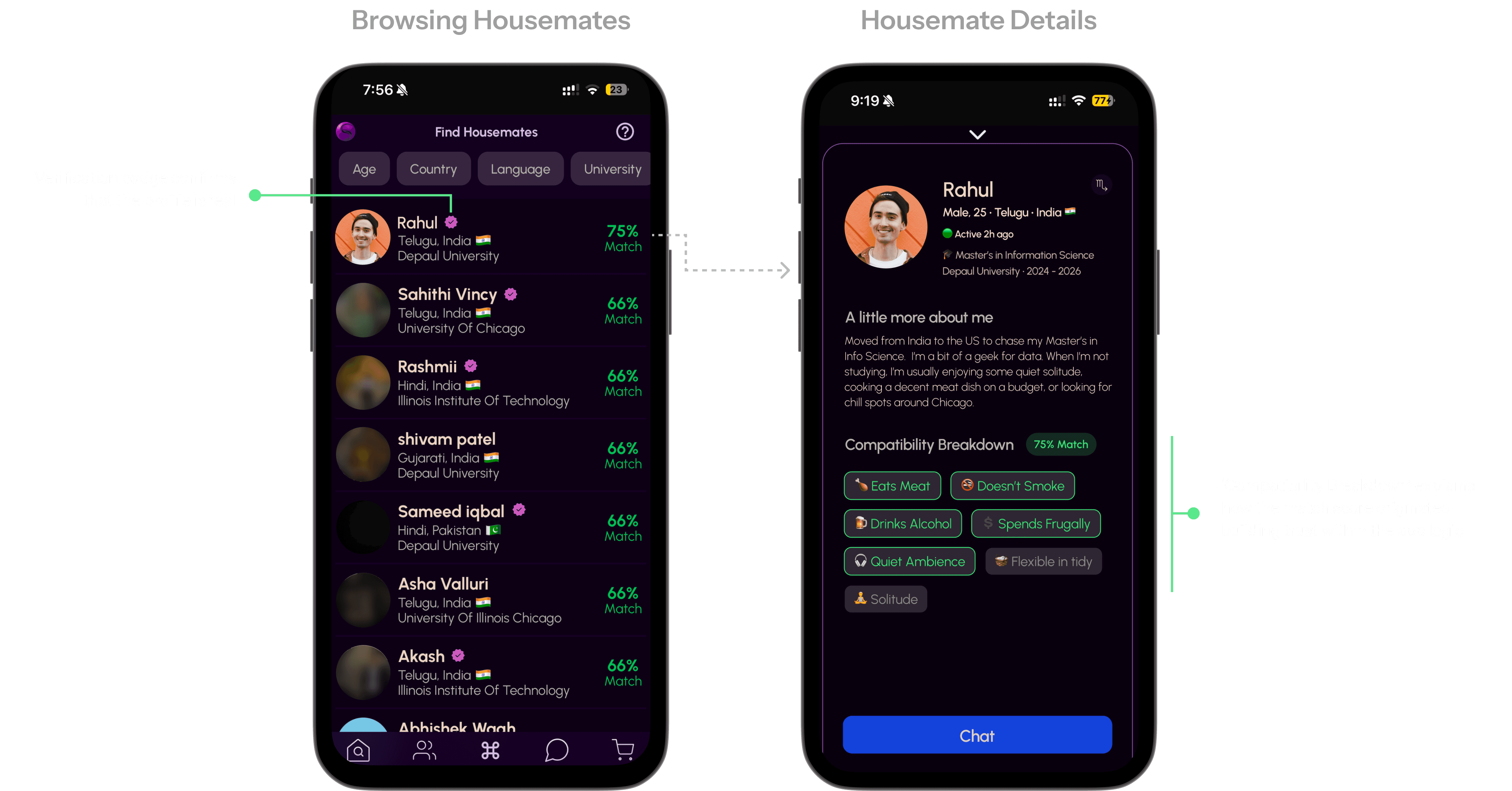 We added visible verification badges and a "compatibility breakdown" so students can immediately see which profiles are real and why someone is a good match.