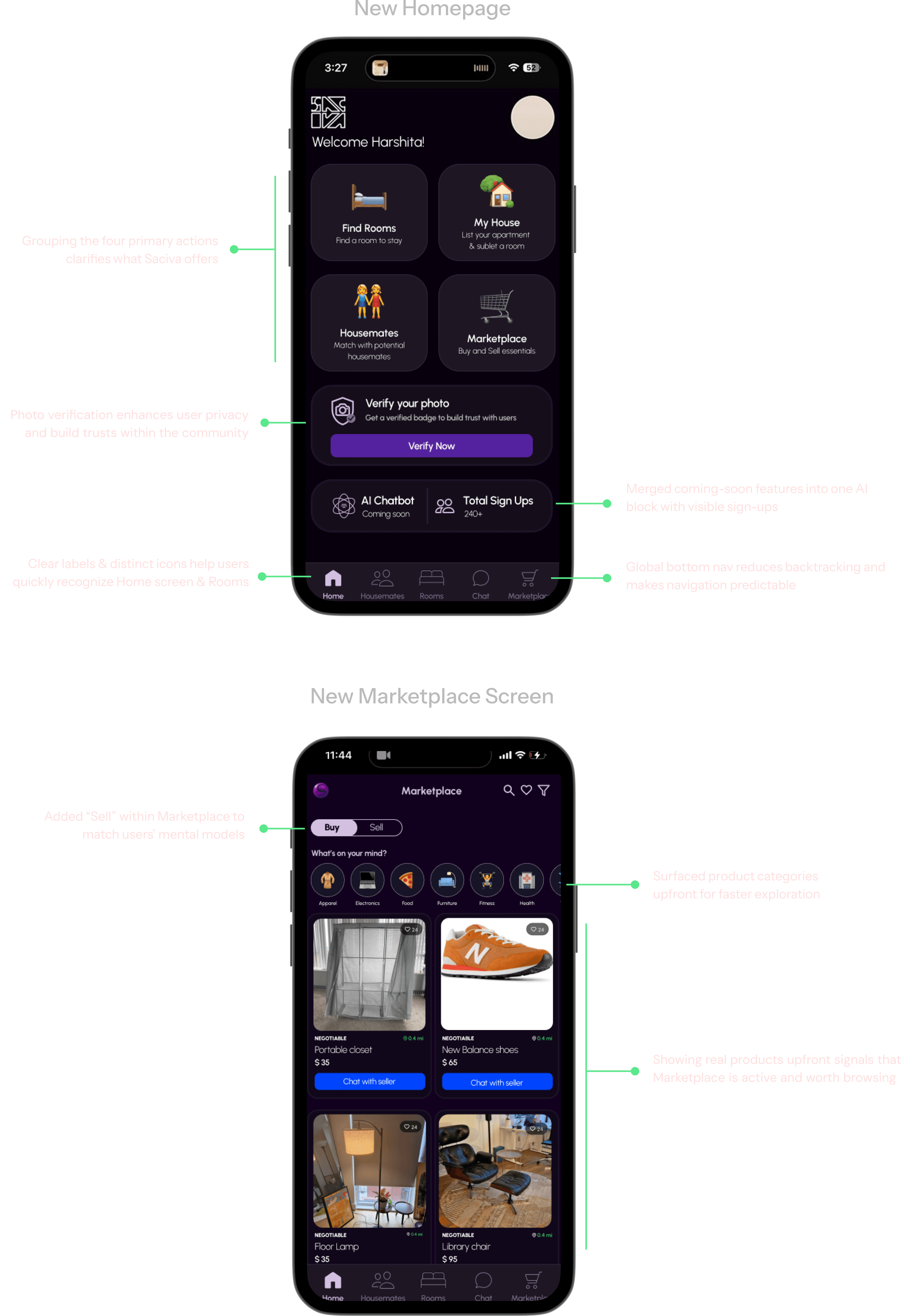 For Marketplace, we replaced the split buy/sell pathways with a single entry point and "Sell a product" CTA, and shifted focus from category-heavy paths to real inventory first